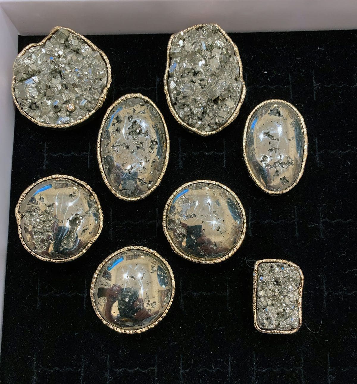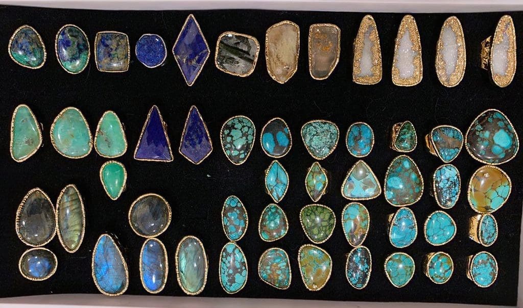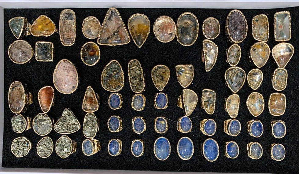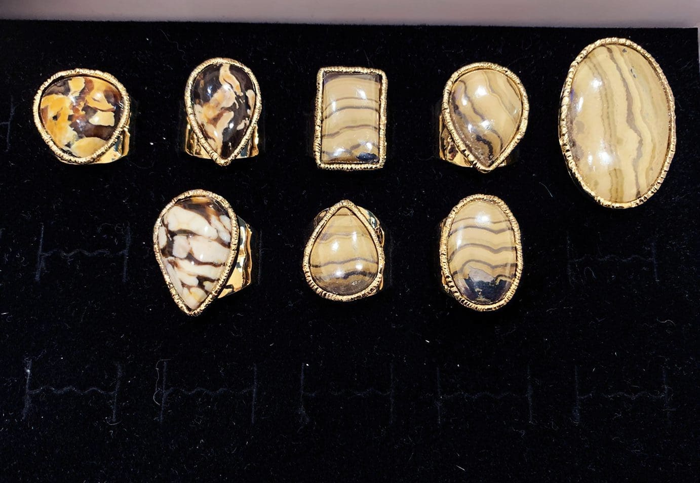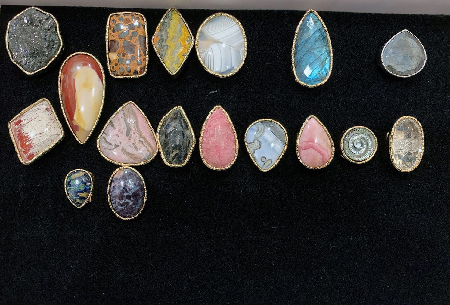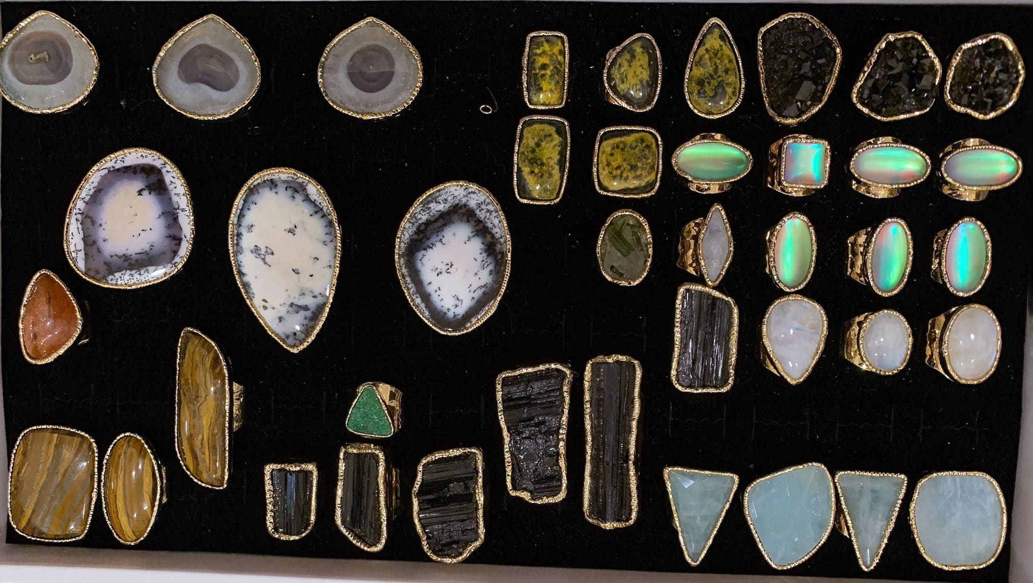 The rings you see here are representative of what we design and make for you and keep in stock. Rings similar to these are in stock on any given day. We use all kinds of stones – from small to large. We try to use stones that are earthy and that have character and at the same time can be a statement piece with lots of flashes.